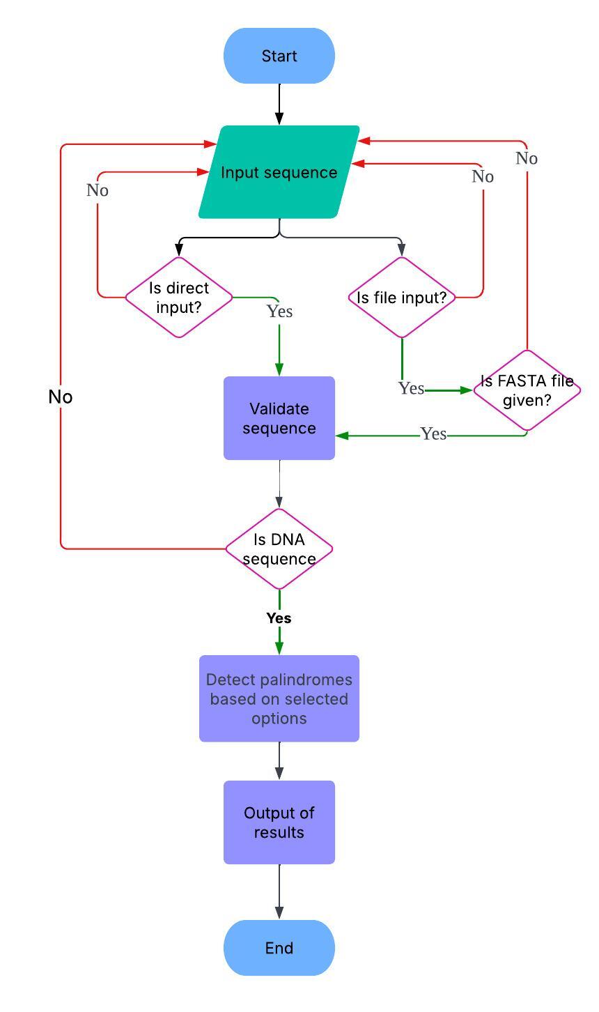 This program starts with the query page where prompt to user for input and the parameters. The input sequence could be directly pasted to the text area or through uploading a file. For the file uploaded, the program validate the file to ensure only .fasta and .fa file being processed. Then the input sequence(s) are validated for nucleotide (A, T, C and G). If the validation passed, this program will run to find palindromes based on the parameters decided by the user. The output will be shown in the result page.